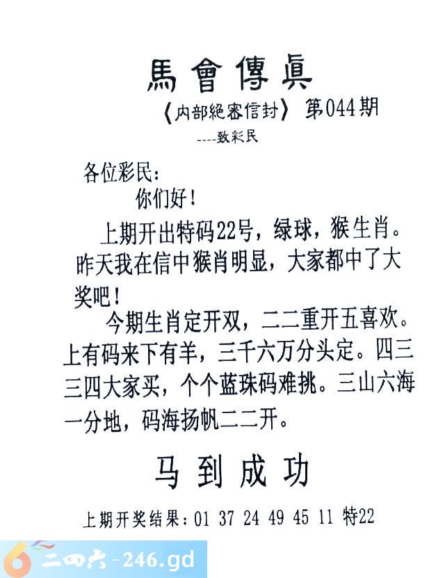 044期:首发推荐:≮馬會傳眞≯→(香港正版)