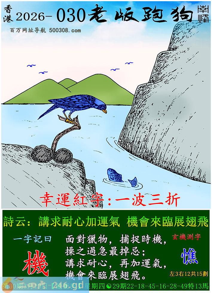 030期老版跑狗一字記之曰:【機】 詩雲:講求耐心加運氣,機會來臨展翅飛。 面對獵物,捕捉時機,操之過急最掉忌; 講求耐心,再加運氣,機會來臨展翅飛。 明给蛇