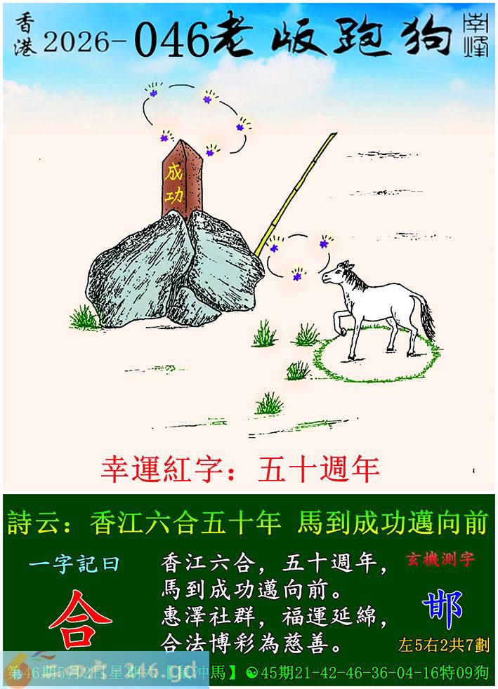 046期老版跑狗一字記之曰:【邯】 詩雲:香江六合五十年,馬到成功邁向前。 香江六合,五十週年,馬到成功邁向前。 惠澤社群,福運延綿,合法博彩為慈善。 玄機測字:《邯》